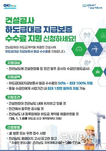 동네방네 김형규 기자 | 전라남도가 건설산업 활력을 높이고 하도급 업체 보호를 위해 ‘2026년 건설공사 하도급대금 지급보증 수수료 지원사업’을 확대 추진한다.
