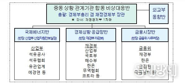 정부는 경제부총리를 중심으로 중동 상황 관련 실물경제, 에너지, 금융시장, 중동 동향 등에 대한 관계기관 합동 비상대응반을 가동하고 중동 현지 상황과 국내외 금융시장, 에너지·수출·해운·항공·공급망 등 실물경제 영향을 24시간 모니터링해 나갈 계획이다. 아울러, 이상징후 발생 시 준비된 상황별 대응계획(Contingency plan)에 따라 관계기관 간 공조 하에 신속하게 대응해 나갈 계획이다.