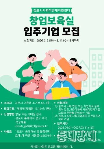 동네방네 김형규 기자 | 김포시는 사회적 가치를 실현하는 초기 사회적경제기업의 안정적인 운영 및 성장을 지원하기 위해 오는 3월 3일부터 11일까지 사회적경제지원센터 창업보육실 입주기업을 모집한다.