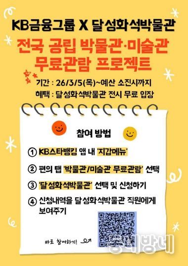 동네방네 김형규 기자 | 대구 달성화석박물관이 문화체육관광부와 KB국민은행, 한국박물관협회가 공동 추진하는 ‘KB×전국 공립 박물관·미술관 무료 관람 프로젝트’에 최종 선정됐다. 문화 접근성 격차를 줄이고 국민의 문화 향유 기회를 확대하기 위해 마련된 공익사업으로, 달성화석박물관은 화석·자연사 분야의 전문성과 지역사회 기여도를 인정받아 지원 대상에 이름을 올렸다.