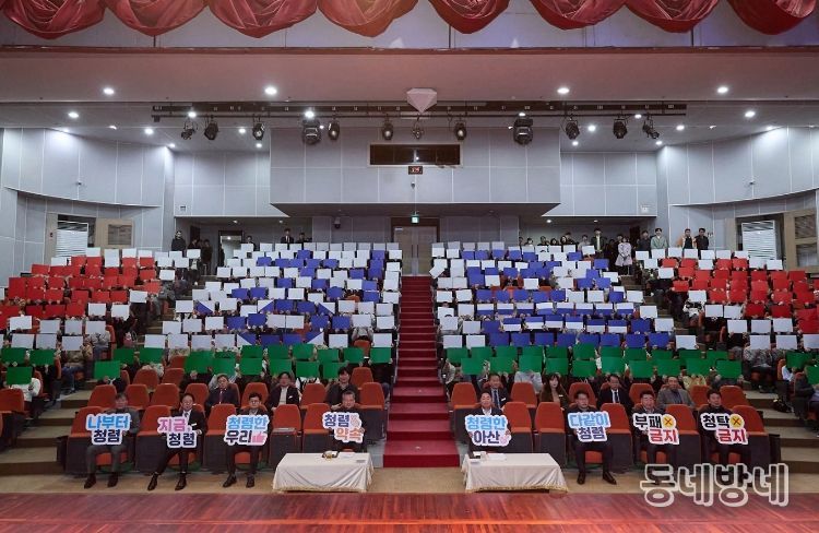 동네방네 김형규 기자 | 아산시 감사위원회(위원장 김점균)는 3일 오전 아산시청 시민홀에서 청렴 선포식과 공직자 청렴교육을 개최하고 청렴 실천 의지를 대내외에 선언했다.