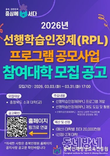 동네방네 김형규 기자 | 충북인재평생교육진흥원은 2026년 선행학습인정제(RPL) 프로그램 공모사업에 참여할 도내 대학을 공개 모집한다.