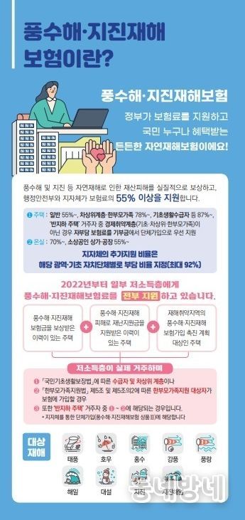 동네방네 김형규 기자 | 전라남도는 풍수해·지진재해보험에 가입하는 취약계층의 보험료 자부담을 줄이기 위해 도비 보조금 지원을 대폭 확대한다고 밝혔다.