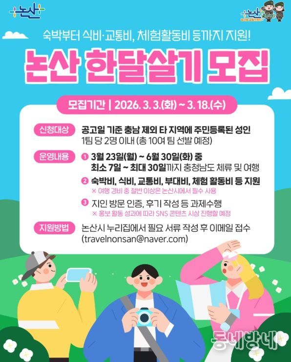동네방네 김형규 기자 | 논산시가 충남 관광의 해를 맞아 ‘2026년 논산 한달살기 관광’참가팀을 모집한다.