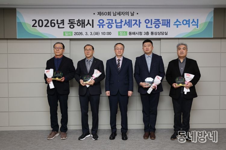 동네방네 김형규 기자 | 동해시는 3월 3일 '제60회 납세자의 날'을 맞아 시청 통상상담실에서 유공납세자 인증패 수여식을 열고 성실납세자들에게 감사의 뜻을 전했다.