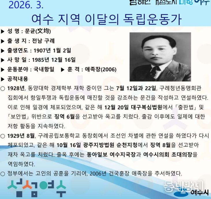 동네방네 김형규 기자 | 여수시는 2026년 3월의 독립운동가로 전남 구례 출신 ‘문균(文均)’ 선생을 선정했다.
