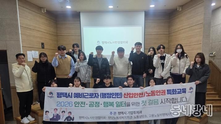 이날 교육에는 대학생 인턴 20여 명이 참석했으며, 고용노동부, 평택시노동상담소, 평택시 노사민정협의회, 대한산업안전협회, 장당노동자복지회관 등 관계기관이 협업해 실무 중심의 교육을 진행했다.