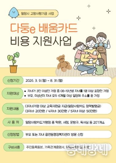 동네방네 김형규 기자 | 경남 밀양시는 다자녀 가정의 교육비 부담을 경감하고 아이 키우기 좋은 환경을 조성하기 위해 ‘다둥e 배움카드 지원 사업’을 본격 시행한다.