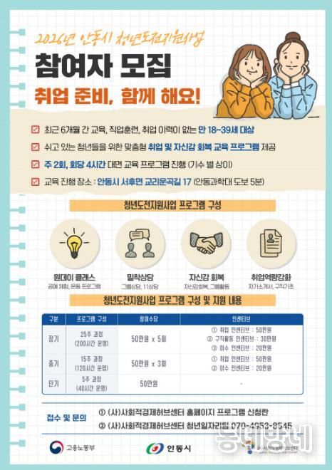동네방네 김형규 기자 | 안동시는 취업 준비 과정에서 어려움을 겪거나 구직 활동을 중단한 청년들을 돕기 위한 ‘청년도전지원사업’의 참여자를 모집한다.