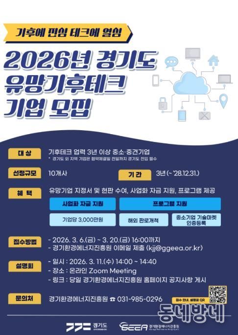 동네방네 김형규 기자 | 경기도와 경기환경에너지진흥원이 기후위기 대응을 선도할 혁신 기술 보유 기업을 발굴하기 위해 오는 3월 20일까지 ‘2026년 경기도 유망 기후테크 기업’ 10곳을 모집한다.