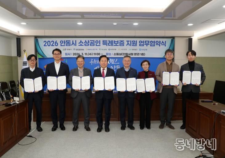 동네방네 김형규 기자 | 안동시는 3월 11일 시청 소통실에서 경북신용보증재단 및 6개 협약은행과 함께 '2026년 안동시 소상공인 특례보증 지원 업무협약'을 체결했다.