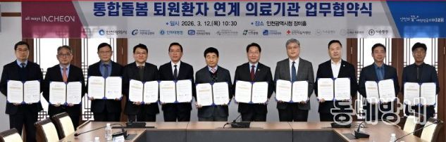 동네방네 김형규 기자 | 인천광역시는 3월 12일 시청 장미홀에서 상급종합병원 등 관내 10개 의료기관과 함께 '통합돌봄 퇴원환자 지역사회 연계 활성화를 위한 업무협약(MOU)'를 체결했다고 밝혔다,