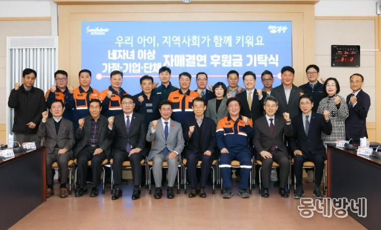 동네방네 김형규 기자 | 광양시는 지난 12일 시청 상황실에서 ‘네 자녀 이상 가정-기업·단체 간 자매결연’ 후원금 기탁식을 개최하고, 지역 내 다자녀 가정을 위한 후원금 9,480만 원을 전달했다고 밝혔다.