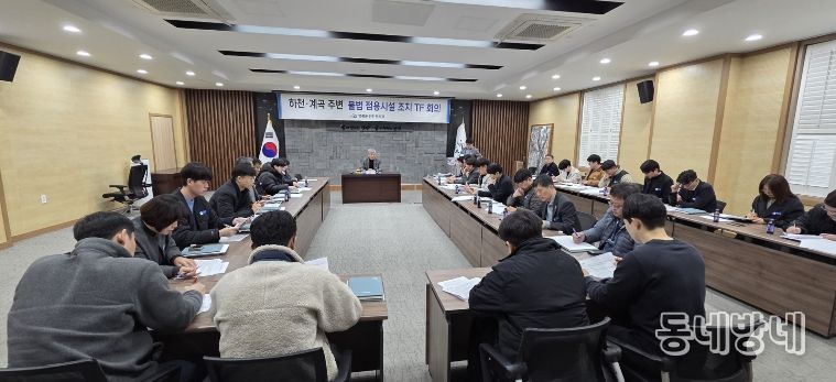 군은 지난 13일 군청 2층 소회의실에서 TF단장인 부군수 주재로 하천·계곡 주변 불법 점용시설 정비를 위해 관련 부서 및 읍·면 팀장과 담당자 등이 참석해 전수조사 추진 방안과 정비 계획을 공유했다. 이번 조치는 최근 국무회의에서 제시된 대통령 지시사항에 따른 후속 대응으로 마련됐다.