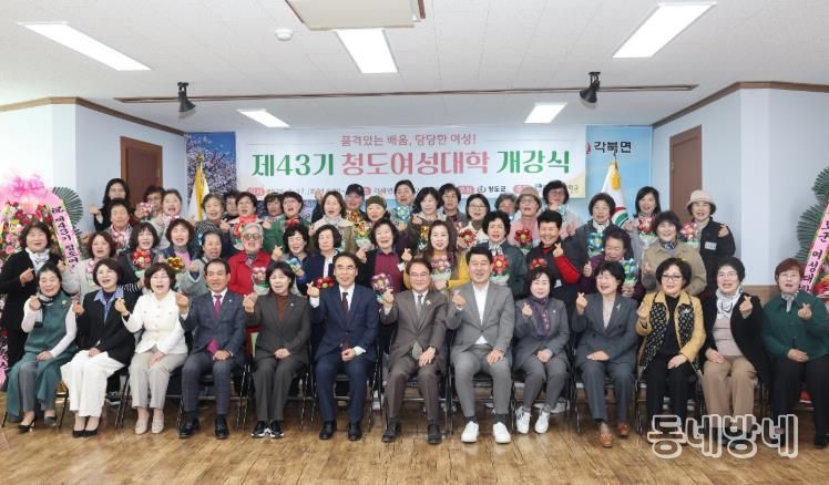 동네방네 김형규 기자 | 청도군은 17일 오후 2시 각북면사무소 회의실에서 수강생과 지역단체장, 여성단체장 등 60여 명이 참석한 가운데 제43기 청도여성대학 개강식을 개최했다.
