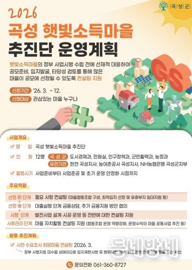 곡성군 관계자는 “햇빛소득마을 추진단을 중심으로 행정과 유관기관이 협력해 마을별 맞춤형 지원체계를 구축해 나가겠다”라며 “사전 컨설팅을 통해 사업 추진 가능성을 꼼꼼히 검토하고 더 많은 마을이 공모사업에 참여할 수 있도록 적극 지원하겠다”라고 말했다.