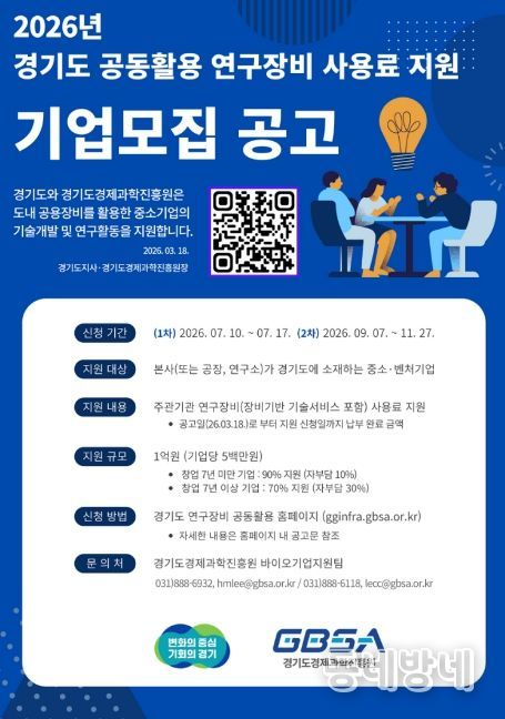 동네방네 김형규 기자 | 경기도와 경기도경제과학진흥원이 도내 중소·벤처기업의 연구개발(R&D) 경쟁력 강화를 위해 ‘2026년 경기도 공동활용 연구장비 사용료 지원 사업’을 추진한다.