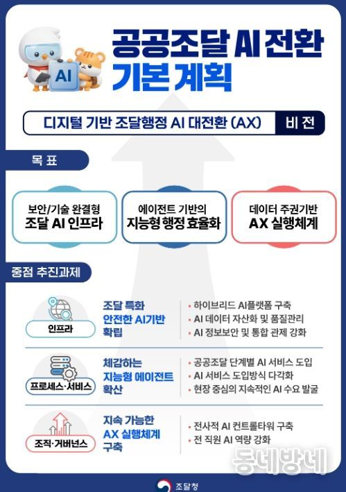 동네방네 김형규 기자 | 조달청은 공공조달에서 활용가능한 AI 서비스의 지속적인 발굴과 안정적이고 체계적인 서비스 제공을 위해 '공공조달 AI 전환 기본계획'을 마련했다고 19일 밝혔다.