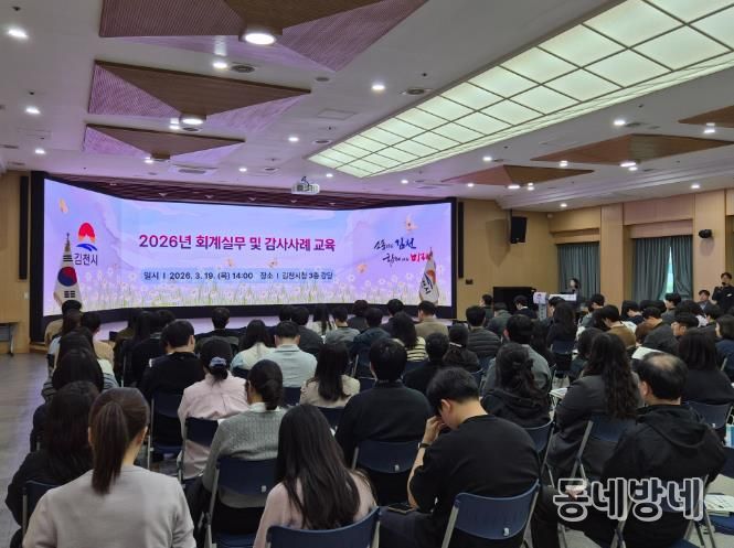 동네방네 김형규 기자 | 김천시는 지난 3월 19일 시청 3층 강당에서 실과소, 읍면동 회계관계 공무원 및 8·9급 직원 200여 명을 대상으로 ‘2026년 회계실무 및 감사사례 교육’을 실시했다.