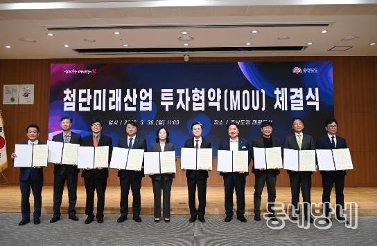 김태흠 지사는 30일 도청 대회의실에서 오세현 아산시장 등 3개 시군 시장·군수, 김동회 디앤알파트너스 대표이사 등 6개 기업 대표와 투자협약(MOU)를 체결했다.