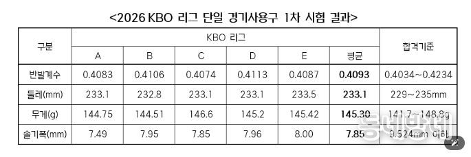 동네방네 김형규 기자 | KBO는 3월 30일(월) 2026 신한 SOL KBO 리그 단일 경기사용구의 1차 수시검사 결과를 발표했다.