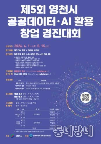 동네방네 김형규 기자 | 영천시는 공공데이터와 AI 기술과 융합한 창의적인 아이디어를 발굴하기 위해, 4월 1일부터 5월 15일까지 ‘2026년 제5회 공공데이터·AI 활용 창업 경진대회’ 신청을 접수한다고 밝혔다.