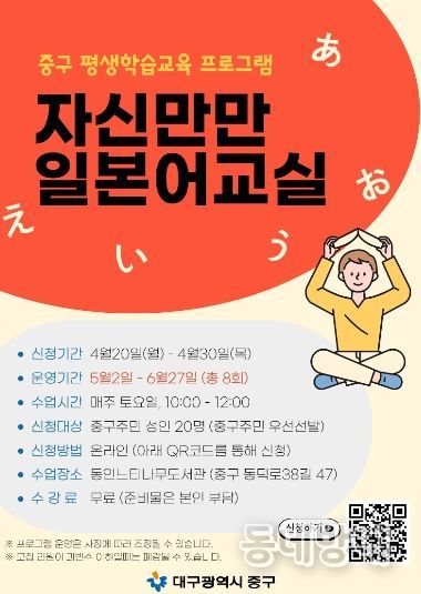 두 과정 모두 중구 주민 성인을 대상으로 과정별 20명을 모집하며, 수강료는 무료다. 신청은 4월 30일까지 대구광역시 중구 통합도서관 누리집(홈페이지) 및 대구 중구 생활문화센터 누리집에 안내된 QR코드를 통해 온라인으로 접수하면 된다.