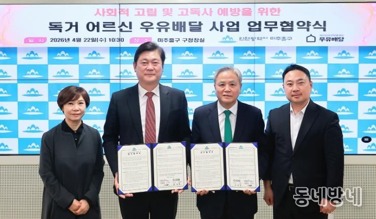 동네방네 김형규 기자 | 인천 미추홀구는 22일 (사)어르신의 안부를 묻는 우유배달과 독거 어르신의 건강한 생활 지원 및 고독사 예방을 위한 ‘어르신의 안부를 묻는 우유배달 사업’ 업무협약을 체결했다.