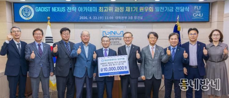 동네방네 김형규 기자 | 경상국립대학교는 4월 22일 오전 11시 대학본부 3층 접견실에서 ‘GADIST NEXUS 전략 아카데미 최고위 과정’ 제1기 원우회의 대학발전기금 전달식을 개최했다.
