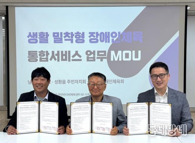 동네방네 김형규 기자 | 천안시장애인체육회는 22일 천안반다비체육센터에서 성환읍 주민자치회, 남서울대학교와 ‘생활밀착형 장애인체육 통합서비스 구축을 위한 업무협약’을 체결했다.