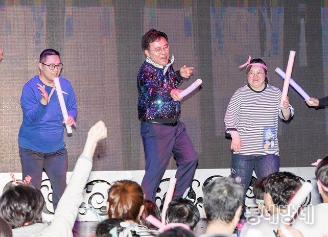한 손에는 야광봉을 든 채 자리에서 펄쩍펄쩍 뛰며 현장 분위기를 한껏 끌어올렸다. 흘러나오는 음악에 맞춰 일명 막춤을 선보이며 15분간 온몸을 쉴 새 없이 움직였다. 무대를 내려와서도 장애인들 가운데로 들어가 함께 호흡하며 춤을 췄다.
