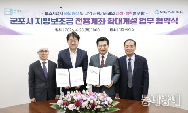 동네방네 김형규 기자 | 군포시는 지방보조금 전용계좌 개설 금융기관을 기존 시 금고인 NH농협은행에 더해 새마을금고까지 확대하기 위한 업무협약을 23일 체결했다고 밝혔다.
