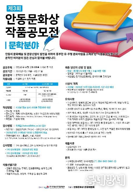 박덕규 안동문화상 운영위원장은 “올해 공모전은 문학과 미술 전반으로 참여의 폭을 넓히고 회화 분야를 통합 운영함으로써, 보다 자유롭고 다양한 창작을 이끌어낼 것으로 기대한다”며 “안동의 문화자원과 역사적 가치를 현대적 감각으로 풀어낸 작품들이 발굴돼, 지역문화의 새로운 가능성을 제시하는 계기가 되길 바란다”고 전했다.