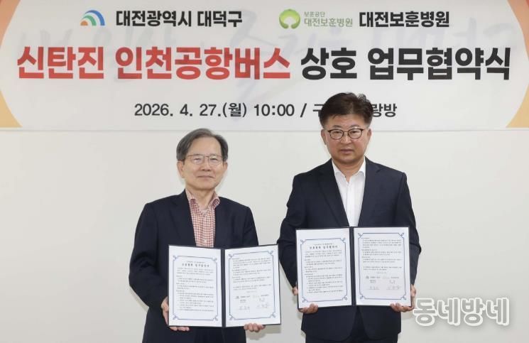 동네방네 김형규 기자 | 대전 대덕구는 27일 신탄진-인천공항 간 공항버스 이용 활성화를 위해 대전보훈병원과 업무협약MOU)을 체결했다.