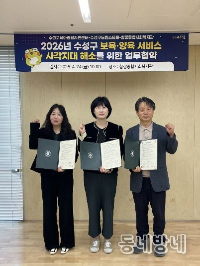 동네방네 김형규 기자 | 대구 수성구육아종합지원센터(센터장 심영숙)는 지난 24일 수성구 드림스타트센터(센터장 김은미), 함장종합사회복지관(관장 권혁철)과 지역 내 보육·양육 서비스 사각지대 해소를 위한 ‘3자 업무협약(MOU)’을 체결했다고 밝혔다.