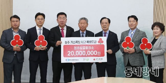 청주상공회의소는 성금 2천만원을 청주시에 전달했다. 차태환 청주상공회의소 회장은 “예기치 못한 사고로 어려움을 겪고 있는 이웃들에게 조금이나마 힘이 되기를 바란다”며 “앞으로도 회원들과 함께 지역사회 소외계층과 재난 피해 이웃을 위한 나눔 활동을 지속적으로 이어가겠다”고 말했다.