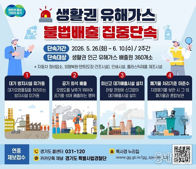 동네방네 김형규 기자 | 경기도 특별사법경찰단이 5월 26일부터 6월 10일까지 2주간 주거지·학교·병원 등 생활권 인근 지역의 유해가스 배출 사업장을 대상으로 불법행위를 집중단속 한다.