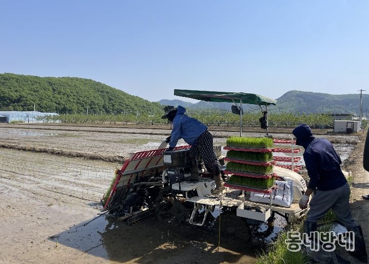 동네방네 김형규 기자 | 경산시 자인면 울옥리 신호철 농가는 27일 자인면 원당들 일원 6ha에 올해 첫 모내기를 실시했다.