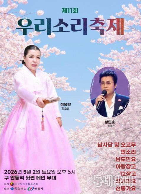 동네방네 김형규 기자 | 사단법인 국악로문화보존회가 주최․주관하는 '제11회 우리소리 축제'가 오는 5월 2일 오후 5시 안동 탈춤공원 무대에서 개최된다.