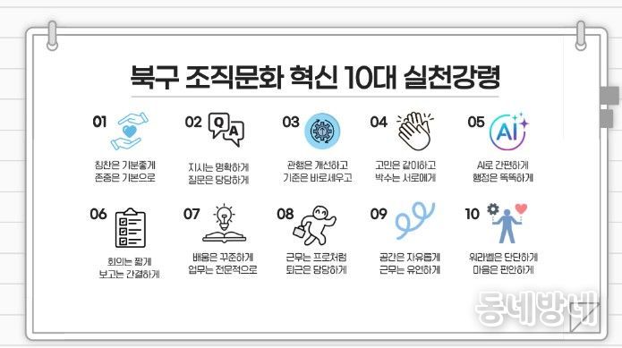 한편, 오는 30일 오후 3시 북구청 3층 회의실에서는 ‘조직문화 혁신을 위한 10대 실천 강령 선언식’이 개최된다.