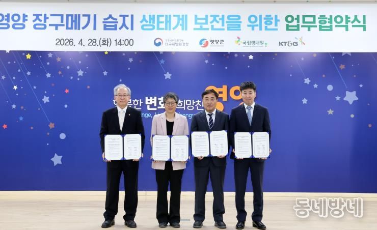 동네방네 김형규 기자 | 영양군은 대구지방환경청, 국립생태원, ㈜KT&G와 4월 28일, 영양 장구메기 습지 생태계 보전을 위한 업무협약을 체결했다.