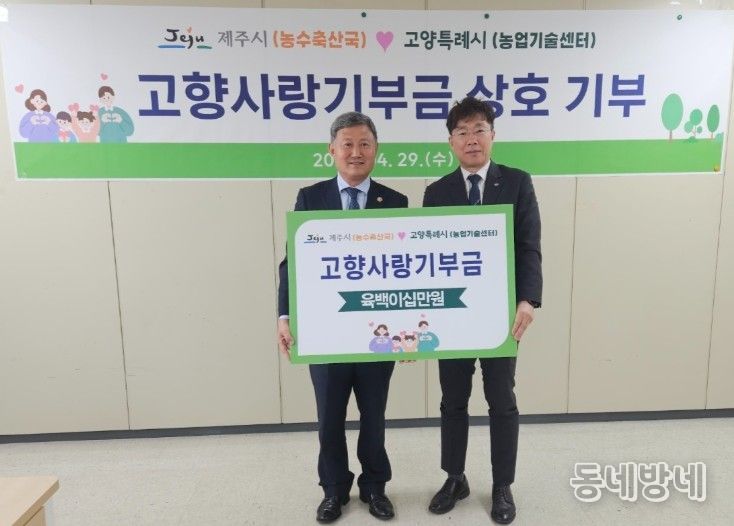 동네방네 김형규 기자 | 제주시는 4월 29일 고양특례시 농업기술센터에서 고양특례시와 고향사랑기부금 상호 전달식을 갖고 지역 간 상생과 협력 강화에 뜻을 모았다.