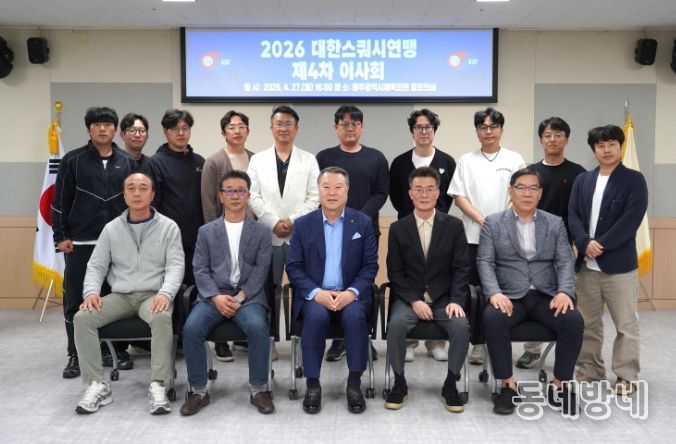 이날 광주광역시체육회관 중회의실에서 대한스쿼시연맹 제4차 이사회에 앞서 전달식이 진행됐다. 대한스쿼시연맹 박세준 회장을 비롯해 임효택·하호성·장현기·정창욱·이재훈 부회장과 전상완 이사 등 20여명이 참석한 가운데 광주광역시체육회 전갑수 회장에게 감사패를 전달했다.
