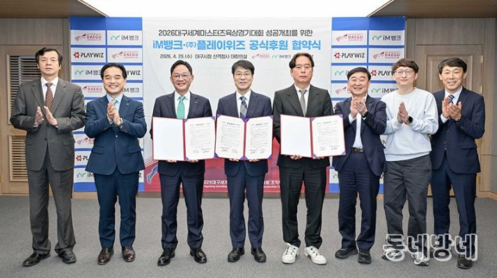 동네방네 김형규 기자 | 2026대구세계마스터즈육상경기대회 조직위원회는 4월 29일 시청 산격청사에서 iM뱅크 및 ㈜플레이위즈와 대회 공식 후원협약을 체결했다.