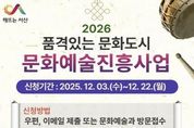 동네방네 김형규 기자 | 충남 서산시는 오는 12월 22일까지 ‘2026년도 문화예술진흥사업’ 공모 신청을 받는다고 밝혔다. 이번 사업은 지역 내 다양한 문화예술 활동을 지원해 시민의 문화 향유 기회를 확대하고, 지역 예술 생태계를 강화하기 위해 추진된다. 시는 지역 문화예술단체의 활성화와 생활 동호인 단체의 저변을 확대하기 위해 전문예술인단체와 생활 동호인 단체로 지원체계를 구분해 지원한다. 지원 대상 사업의 분야는 문학, 시각, 공연, 전통예술, 청소년 대상 문예활동 등으로, 한 단체당 한 사업만 지원되며, 총사업비의 20% 이상을 자부담해야 한다. 지방보조금관리시스템(보탬e)에 등록 및 회원가입을 완료한 단체만 신청할 수 있으며, 신청은 서산시 문화예술과 방문, 메일, 우편을 통해 할 수 있다. 시는 지원자격, 제출서류 확인 등 자체 심사 후 서산시 보조금 심의위원회의 심의를 거쳐 내년도 1월 중 최종 선정할 계획이며, 선정된 단체에 개별 통보할 예정이다. 시 관계자는 “서산의 문화예술 활성화와 저변 확대를 위하여 추진하는 내년도 문화예술진흥사업에 많은 참여 부탁드린다