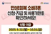 동네방네 김형규 기자 | 2차 민생회복 소비쿠폰의 신청 기한이 오는 31일 마감되는 가운데, 충남도가 도내 미신청자에 대해 기한 내 신청·사용할 것을 당부했다. 신청 마감일은 31일 오후 6시로, 기한 내 신청해야 10만 원을 지원받을 수 있다. 민생회복 소비쿠폰은 지역경제에 신속히 활력을 불어넣기 위해 사용기한이 명확히 설정돼 있다. 사용기한은 이미 지급된 1차분과 2차분 모두 다음달 30일까지다. 온오프라인으로 받은 카드 포인트는 기한 내 사용해야 하며, 기한이 지나면 잔액은 자동 소멸한다. 종이형 상품권도 기한이 지나면 사용이 불가하다. 소비쿠폰 통계 시스템 자료에 의하면 도내 1차 온라인 지급분 기준 3280억 원 중 2.5%인 83억여 원이 아직 사용되지 않은 것으로 나타났다. 도의 2차 소비쿠폰 지급률은 24일 기준 96%로, 지급 대상자 중 7만여 명의 도민이 아직 받지 않은 것으로 집계됐다. 도 관계자는 “민생회복 소비쿠폰은 국민의 가계 부담을 덜고 지역경제를 회복하기 위한 실질적 민생 지원 정책”이라며 “신청 마감일은 10월 31일,