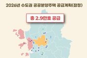 동네방네 김형규 기자 | 국토교통부와 4개 공공기관은 ’26년 수도권 공공택지에서 총 2.9만호 규모의 공공분양주택을 순차적으로 공급할 계획이라고 밝혔다. 이번 공급 물량은 새정부 「주택공급 확대방안」(9·7대책)에서 발표한 수치(2.7만호) 대비 약 2천호 증가한 규모로, 판교(2.9만호)급 신도시를 하나 새로 조성한 것에 준하는 수준이다. 특히, 4개 공공기관의 올해 분양 물량(2.2만호)보다 32.2% 증가했고, 최근 5년간 평균 수도권 분양 물량(1.2만호)의 약 2.3배 수준으로, 공공 부문의 착공 확대 노력의 성과가 가시화되며, 공급 확대 국면으로 전환되고 있음을 보여준다. 내년에 분양될 단지들을 살펴보면, 지역별로는 △서울 1.3천호, △인천 3.6천호, △경기 23.8천호로 분포되어 있고, 주요 지구별로는 △3기 신도시 7.5천호, △2기 신도시 7.9천호, △기타 중소택지 13.2천호의 공공주택이 분양될 예정이다. 3기 신도시에서는 △고양창릉(3,881호), △남양주왕숙(1,868호), △인천계양(1,290호), 2기 신도시에서는 △광교(600호), △평택고덕(5,134호), △화