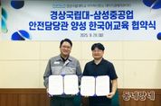 동네방네 김형규 기자 | 경상국립대학교 RISE사업단 산학친화프로그램과 삼성중공업은 9월 29일 오후 가좌캠퍼스 언어교육실 국제교육부처장실에서 외국인 근로자의 안전한 근로환경 조성과 지역사회 정주 여건 조성을 위해 ‘외국인 근로자 대상 한국어 교육체계 구축에 관한 업무협약’을 체결했다. 이 협약은 경상국립대학교 RISE사업단의 지역 연계협력 강화의 일환으로, 삼성중공업에 근무하는 외국인 근로자의 안전 역량을 강화하고 지역사회 적응을 돕기 위한 한국어 교육체계를 산학 공동으로 개발·운영하기 위한 것이다. 이를 통해 산업현장 맞춤형 실용 한국어 교육 프로그램을 개발하고 산학협력에 기초한 유기적인 교육지원 체계를 구축할 수 있을 것으로 기대된다. 이날 협약체결식에는 경상국립대학교 RISE사업단 산학친화프로그램 부수현 책임교수, 국어교육학과 유해준 교수와 삼성중공업 이상억 총무팀장 등 7명이 참석했다. 행사는 전체 사업 소개, 협약 내용 설명, 협약서 서명, 기념촬영 등의 순으로 진행됐다. 양 기관은 협약서에서 ▲외국인 근로자 대상 한국어 교육 프로그램 개발 및 운영 ▲외국인 안전담당관 양성 및 한국어 교육 기반 안전