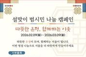 동네방네 김형규 기자 | 서울시는 3월 9일까지 서울잇다푸드뱅크센터와 함께 '2026년 설맞이 범시민 나눔 캠페인'을 추진한다. 이번 캠페인은 개인, 기업, 기관의 자발적인 식품 및 생활용품 기부로 진행되며, 시는 이를 통해 취약계층이 소외되지 않는 따뜻한 겨울을 보내고 지역사회 전반에 나눔문화가 확산되길 기대하고 있다. 기부 가능한 품목은 통조림, 캔음료, 라면, 쌀 등 장기간 보관이 가능한 식품과 생활용품(의류, 휴지, 치약 등)이며, 소비기한이 임박한 식품은 기부가 제한된다. 신선·냉장·냉동식품의 경우 자치구 잇다푸드뱅크 문의를 통해 기부 가능 여부를 사전 확인해야 한다. 해당 캠페인은 매년 설과 추석 명절에 추진되는 범시민 참여형 나눔 행사로, 지난해에는 총 16억 4천만 원 상당의 기부금과 현물의 온정이 모였으며, 서울시 취약계층 25,078가구에 전달됐다. 캠페인 참여를 원하는 경우 구청, 동주민센터, 아파트, 교회 등 자치구별 거점기관에 설치된 기부박스에 식품과 생활용품 등의 현물을 기부할 수 있으며, 기부박스 설치 위치 등 세부 참여 장소는 서울잇다푸드뱅크 누리집 ‘참여하기-캠페인후원’에서 확인할