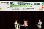 동네방네 김형규 기자 | 포항시는 22일 농업인교육복지관에서 2025년 하반기 ‘어린이농부학교’ 졸업식을 진행했다. 이날 행사에는 수료 어린이와 가족, 관계자 등 80여 명이 참석해 지난 4개월간의 활동을 돌아보고 성장을 함께 축하하는 시간을 가졌다. 졸업식은 텃밭 골든벨 퀴즈, 수료증 및 기념품 전달, 소감 발표, 단체사진 촬영 순으로 진행됐다. 포항시 어린이농부학교는 상·하반기로 운영되며, 이번 하반기 과정은 8월부터 11월까지 매주 토요일 총 12회차 프로그램으로 구성됐다. 참여한 어린이 30명 전원이 성실히 전 과정을 마치고 졸업장을 받았다. 교육은 텃밭 채소 재배, 벼 베기 및 탈곡 체험, 환경 감수성을 기르는 활동 등 이론과 실습을 병행한 도시농업 프로그램으로 구성돼 높은 호응을 얻었다. 특히 커피박 유기비료 만들기, 누에 키우기, 허수아비 만들기, 수확 작물로 진행한 팜파티 등 체험 중심 프로그램이 큰 인기를 끌었으며, 가족 단위로 참여할 수 있어 교육 효과도 더욱 높았다는 평가다. 이현주 포항시 농업기술센터 소장은 “어린이들이 흙을 만지고 작물